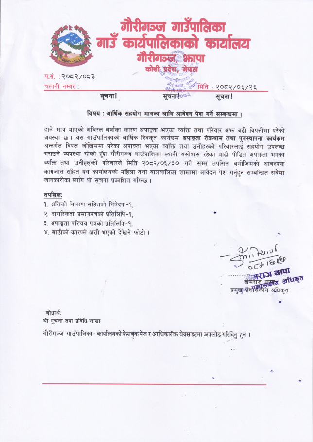 (२०८२/०६/२६) आर्थिक सहयोग मागका लागि आवेदन पेश गर्ने सम्बन्धी सूचना ।