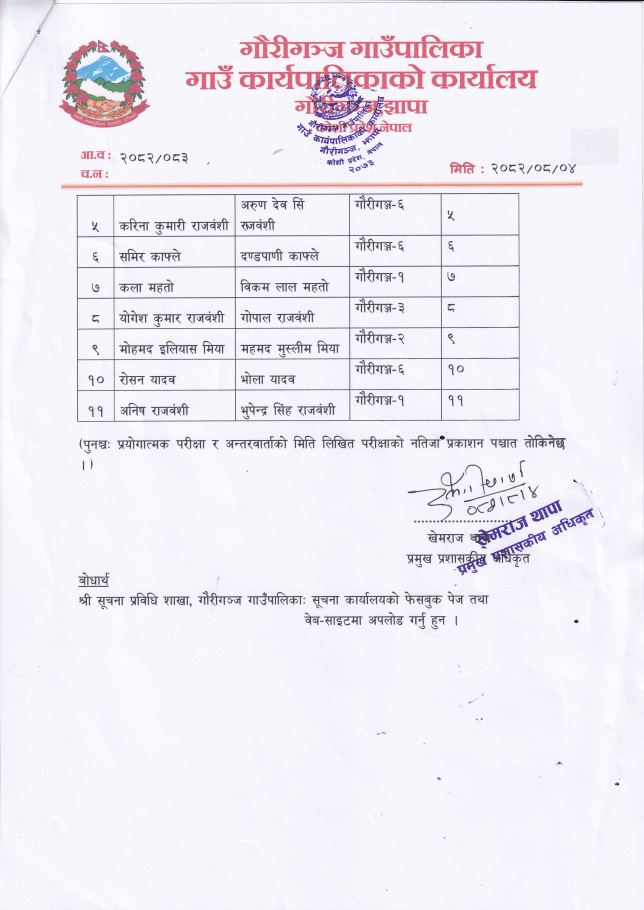 (२०८२/०८/०४) प्रारम्भिक योग्यताक्रमबाट छनोट भएका उम्मेद्वारहरुको सूची र परीक्षाको सूचना ।