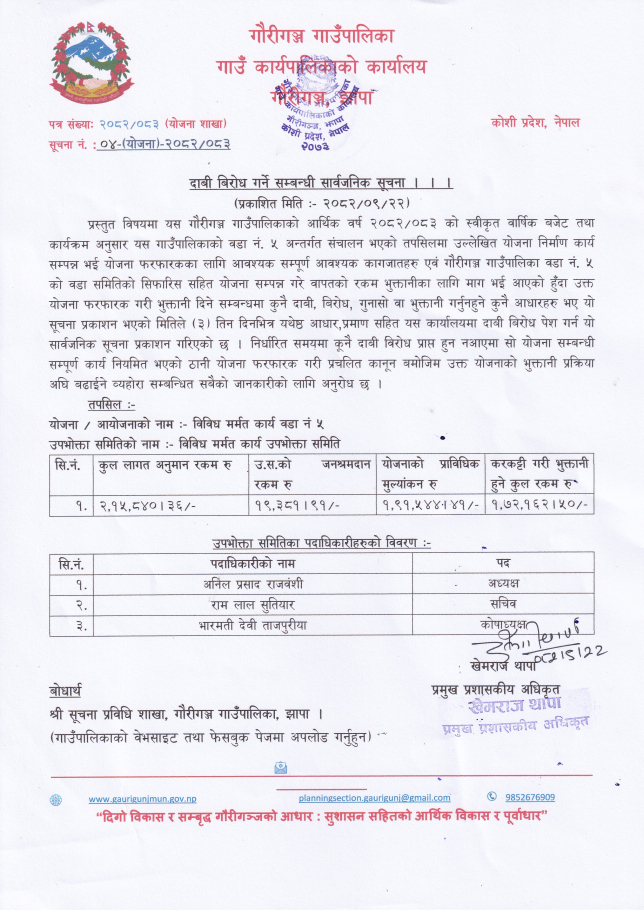 » (२०८२/०९/२२) दाबी बिरोध गर्ने सम्बन्धी सार्वजनिक सूचना ।