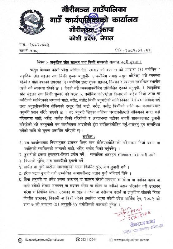 (२०८२/०९/२२) प्राकृतिक स्रोत सङ्कलन तथा बिक्री सम्बन्धी अत्यन्त जरुरी सूचना ।
