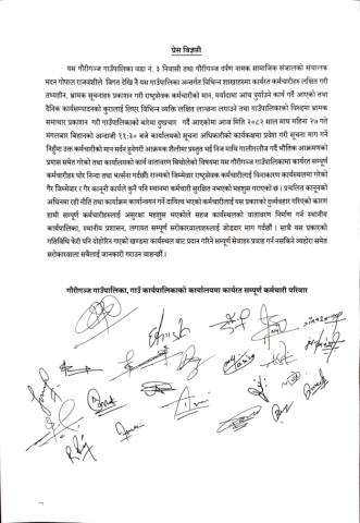 (२०८२/१०/२७) गौरीगञ्ज गाउँपालिका गाउँ कार्यपालिकाको कार्यालयमा कार्यरत कर्मचारीहरुद्वारा प्रकाशित प्रेस विज्ञप्ती ।
