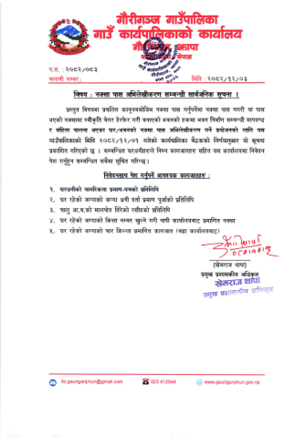 (२०८२/१२/०३) नक्सा पास अभिलेखीकरण सम्बन्धी सार्वजनिक सूचना ।