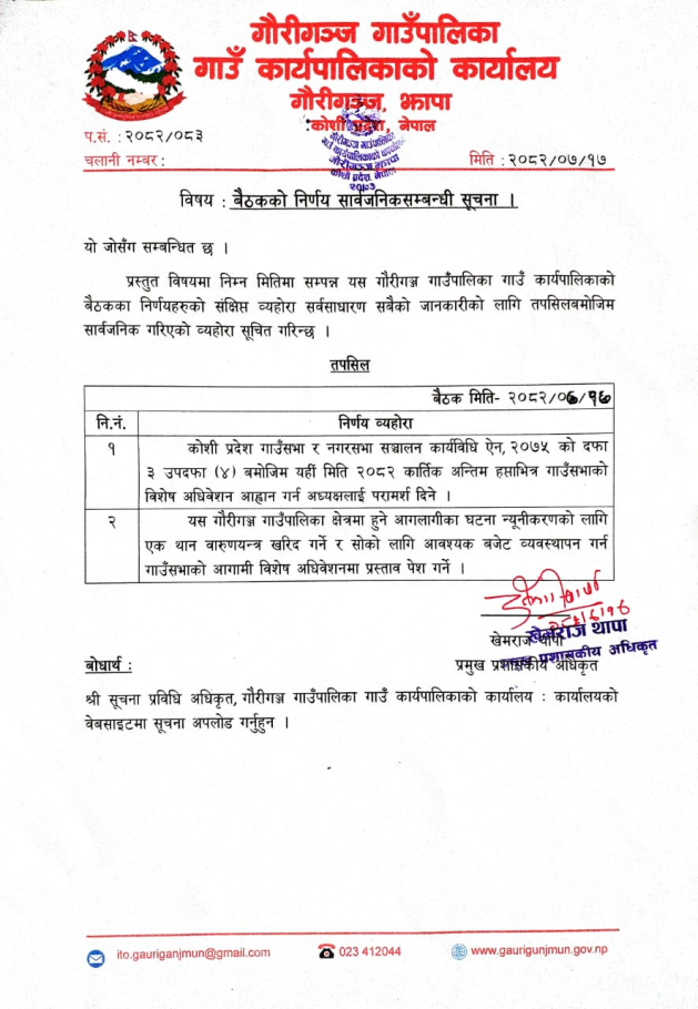 २०८१-०८-१९ बैठकको निर्णय सार्वजनिक सम्बन्धमा ।