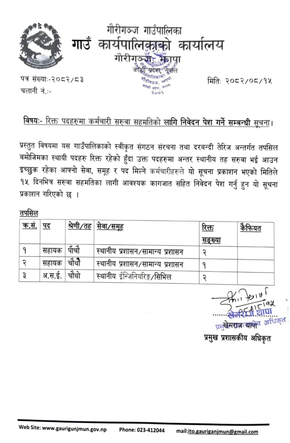 (२०८२/०८/१५) रिक्त पदहरुमा कर्मचारी सरुवा सहमतिको लागि निवेदन पेश गर्ने सम्बन्धी सूचना ।