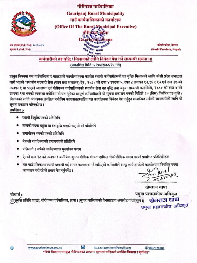 (२०८२/०८/२५) कर्मचारीको तह वृद्धि / मिलानको लागि निवेदन पेश गर्ने सम्बन्धी सूचना ।