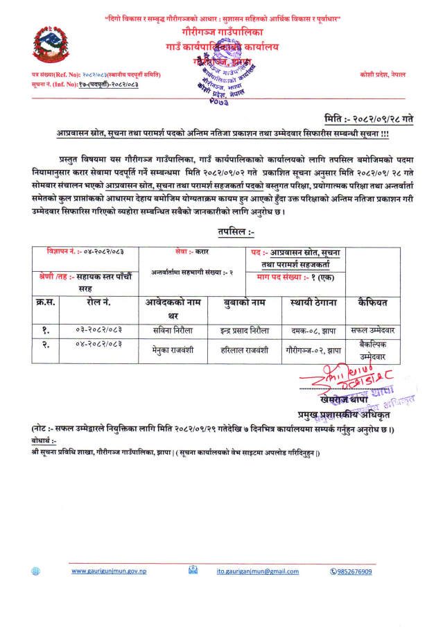 » (२०८२/०९/२८) आप्रवासन स्रोत, सूचना तथा परामर्श पदको अन्तिम नतिजा प्रकाशन तथा उम्मेदवार सिफारिस सम्बन्धी सूचना ।