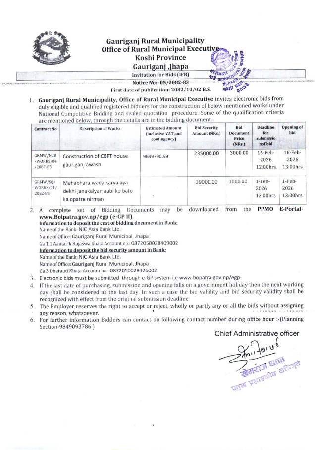 (२०८२/१०/०६) ठेक्का आव्हान सम्बन्धी सूचना ।