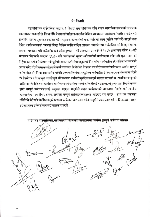 (२०८२/१०/२७) गौरीगञ्ज गाउँपालिका गाउँ कार्यपालिकाको कार्यालयमा कार्यरत कर्मचारीहरुद्वारा प्रकाशित प्रेस विज्ञप्ती ।