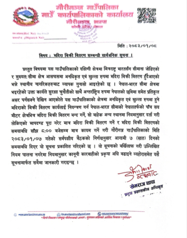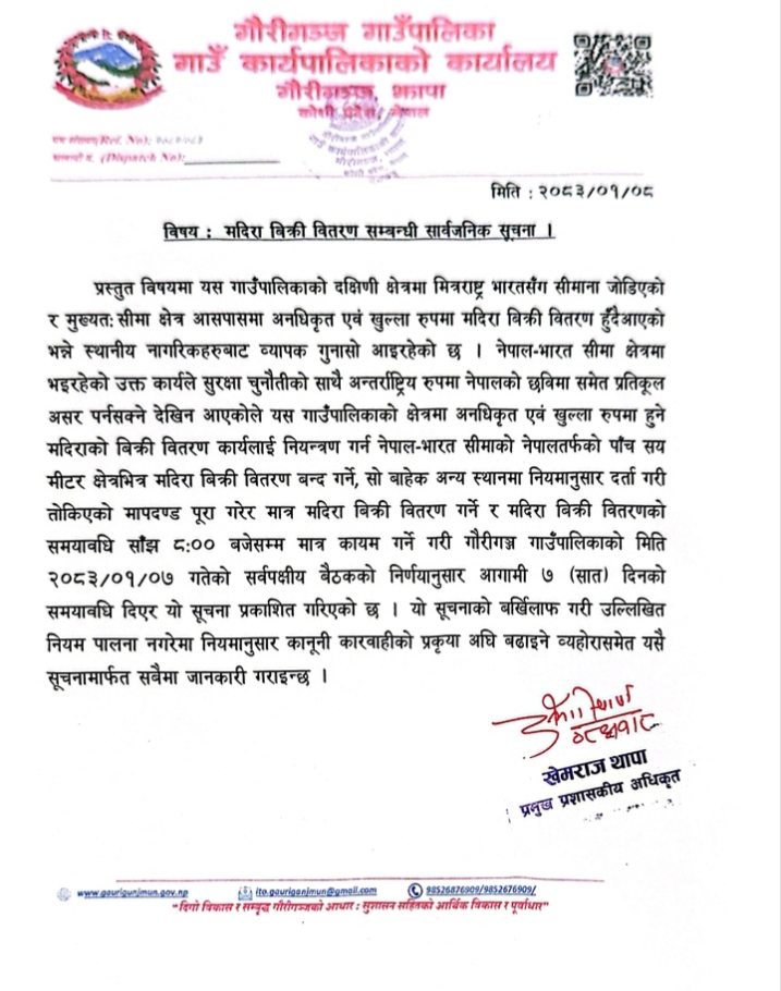 (२०८३/०१/०८) मदिरा बिक्री वितरण सम्बन्धी सार्वजनिक सूचना ।