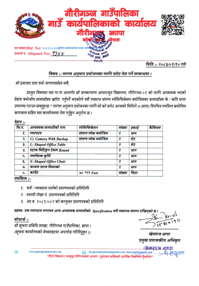 (२०८३/०१/१०) लागत अनुमान प्रयोजनका लागि दररेट पेश गर्ने सम्बन्धमा ।